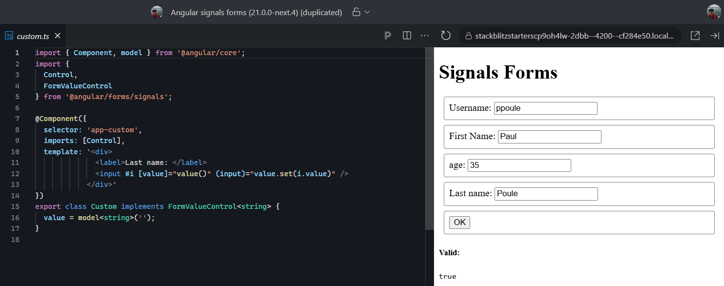 Impossible de m'en souvenir une fois dans mon train pour Paris ! Je me suis retrouvé avec un Stackblitz Angular 21.0.0-next.2 et aucun champ de formulaire personnalisé.